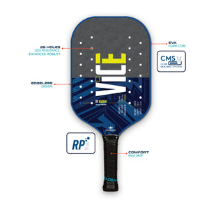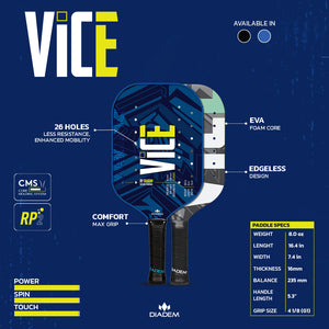 The Diadem Vice Paddle was designed to take the game of pickleball to the next level. This revolutionary new concept paddle includes technology never seen before in a pickleball paddle. The unique RP2 Grit Coating combines grit paint with a PU coating to lock in long lasting spin production.