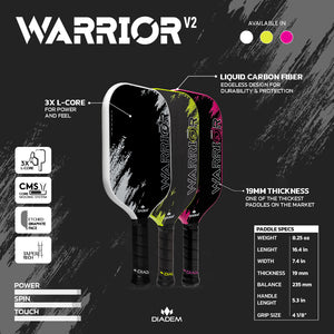 Combining multiple technologies developed by Diadem Sports and seen previously in the DIADEM WARRIOR EDGE, VICE and ICON V2, the DIADEM WARRIOR V2 is our most advanced pickleball paddle to date. The 19 mm thickness and 3X L-Core enable a player to feel the ball better on dinks while still generating power on hard hits. The Taper Tech moulded handle allows the Warrior V2 to have a comfortable feel and slim 4 1/8th grip size.