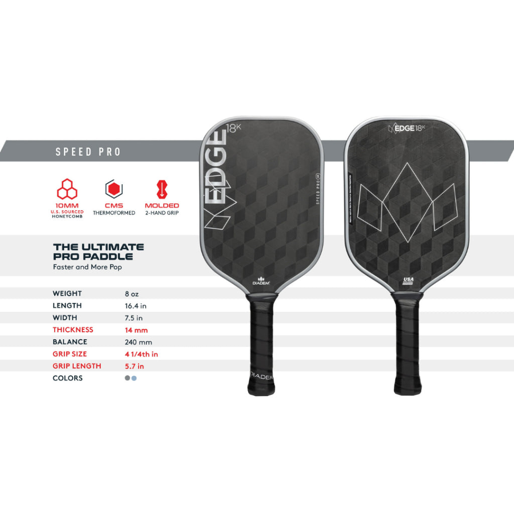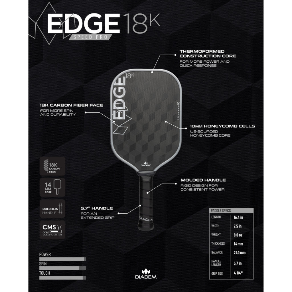 Introducing the Edge 18k Speed Pro by Diadem, it is fast, real lightning fast. Crafted with precision and engineered for speed, this paddle combines cutting-edge technology with meticulous construction to deliver speed and pop to your game.