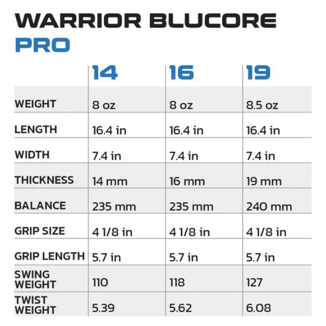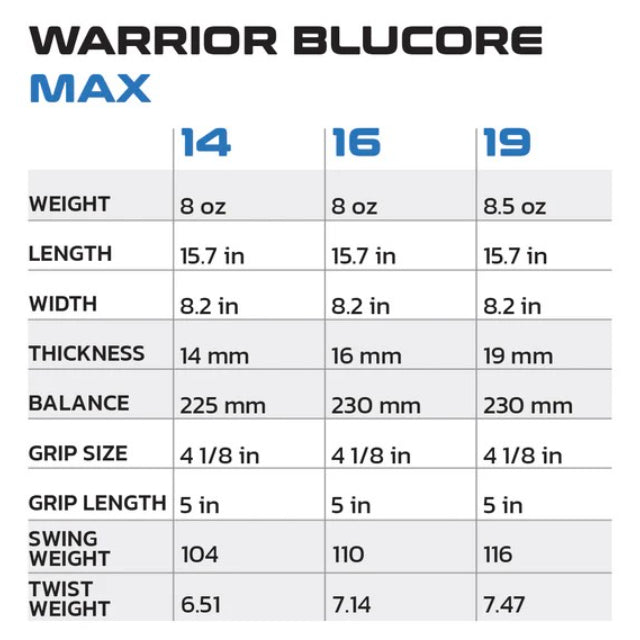 The Warrior BluCore Series comes in nine unique models across three thicknesses (14mm, 16mm, 19mm) and three shapes (pro, standard, max), allowing you to find the perfect fit for your game.